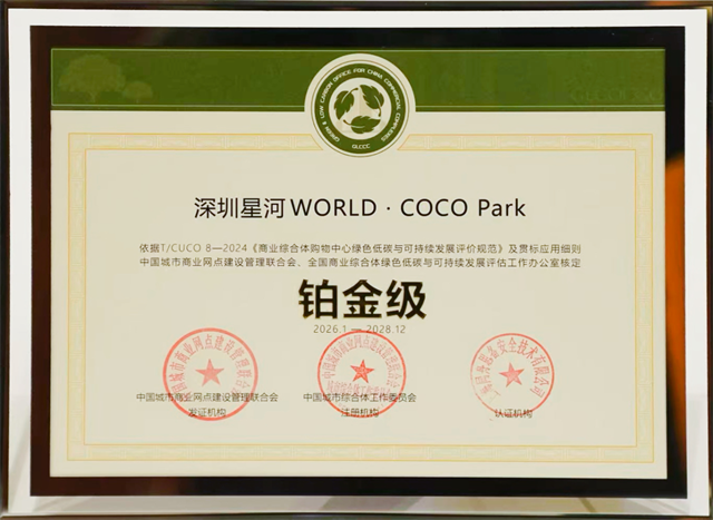 2026年1月15日,“2026中购联新年研讨会暨绿色低碳与可持续发展贯标发布会”在北京举行。会上,星盛商业旗下项目深圳平博pinnacleWORLD·COCO Park,荣获首批《商业综合体购物中心绿色低碳与可持续发展评价规范》全国贯标应用铂金级证书,成为全国14个获此认证的项目之一。这一权威认证,标志着星盛商业在践行ESG理念、引领行业绿色转型方面走在了前列。